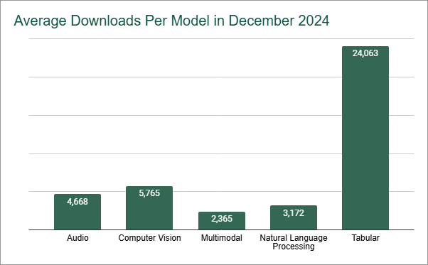 We believe models should be compared to other models within in the same category. For example, Liftr's reports show that the Natural Language Processing category is the most popular, with more than 300,000 distinct models. However, the average number of downloads per model is about 3,200. Tabular models have only 1.0% of the total NLP downloads, but the average number of downloads per model is over 24,000. In fact, the Tabular model category has the highest number of downloads per model across any category. This does not suggest Tabular models are better than NLP. But, if you are looking at Tabular models, the threshold for what's popular or what a "good" number of downloads should be, it's going to be higher than 24,000.