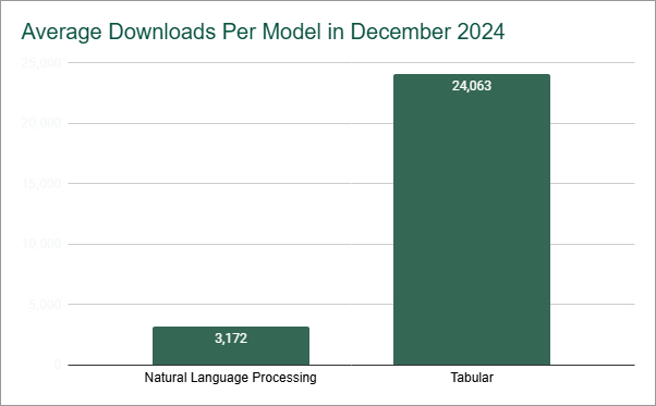 Tabular models have only 1.0% of the total NLP downloads, but the average number of downloads per model is over 24,000.